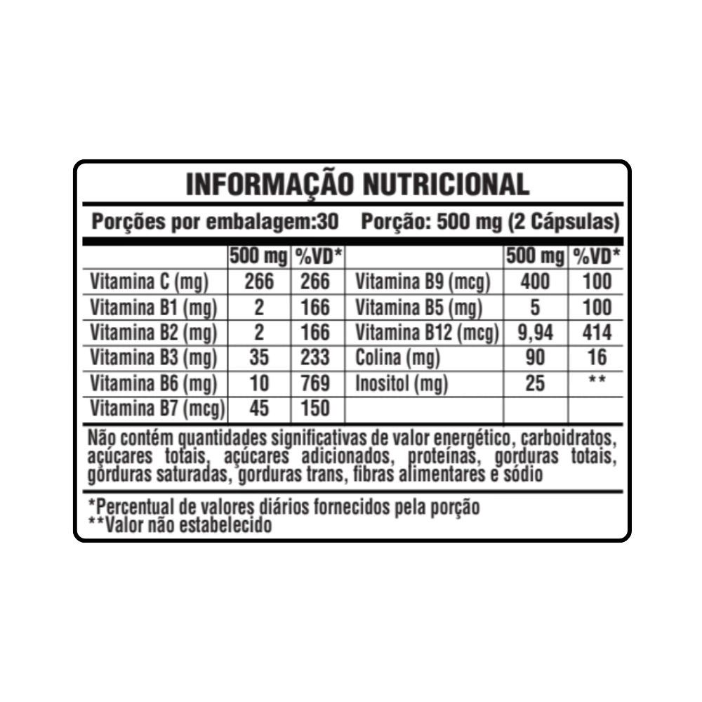 Ácido ascórbico, cloreto de colina, inositol, niacinamida, cloridrato de piridoxina, DL-pantenol, cloridrato de tiamina, riboflavina, ácido fólico, D-biotina e cianocobalamina.