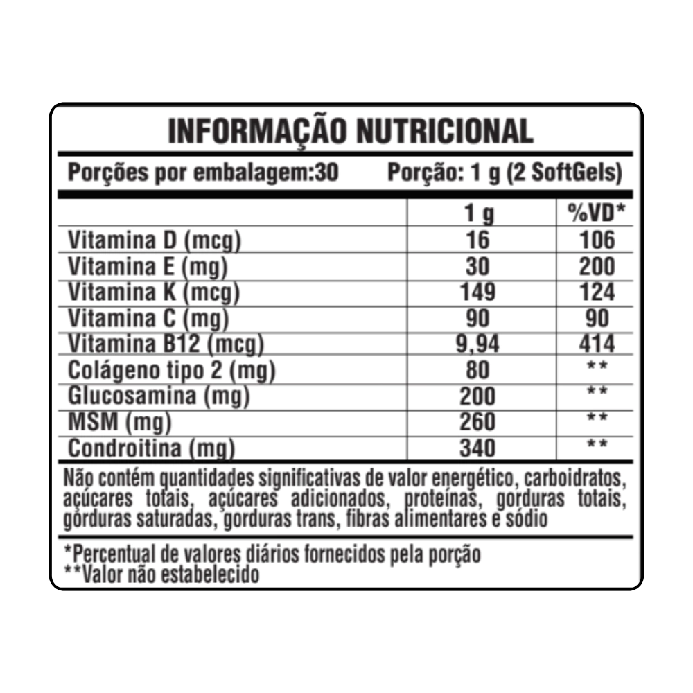 Sulfato de condroitina produzido a partir da fermentação de Escherichia coli, metilsulfonilmetano (MSM), sulfato de glucosamina, ácido ascórbico (vitamina C), colágeno tipo 2, DL alfa-tocoferol (vitamina E), menaquinona-7 (vitamina K7), colecalciferol (vitamina D3), cianocobalamina (vitamina b12) e óleo de Girassol.