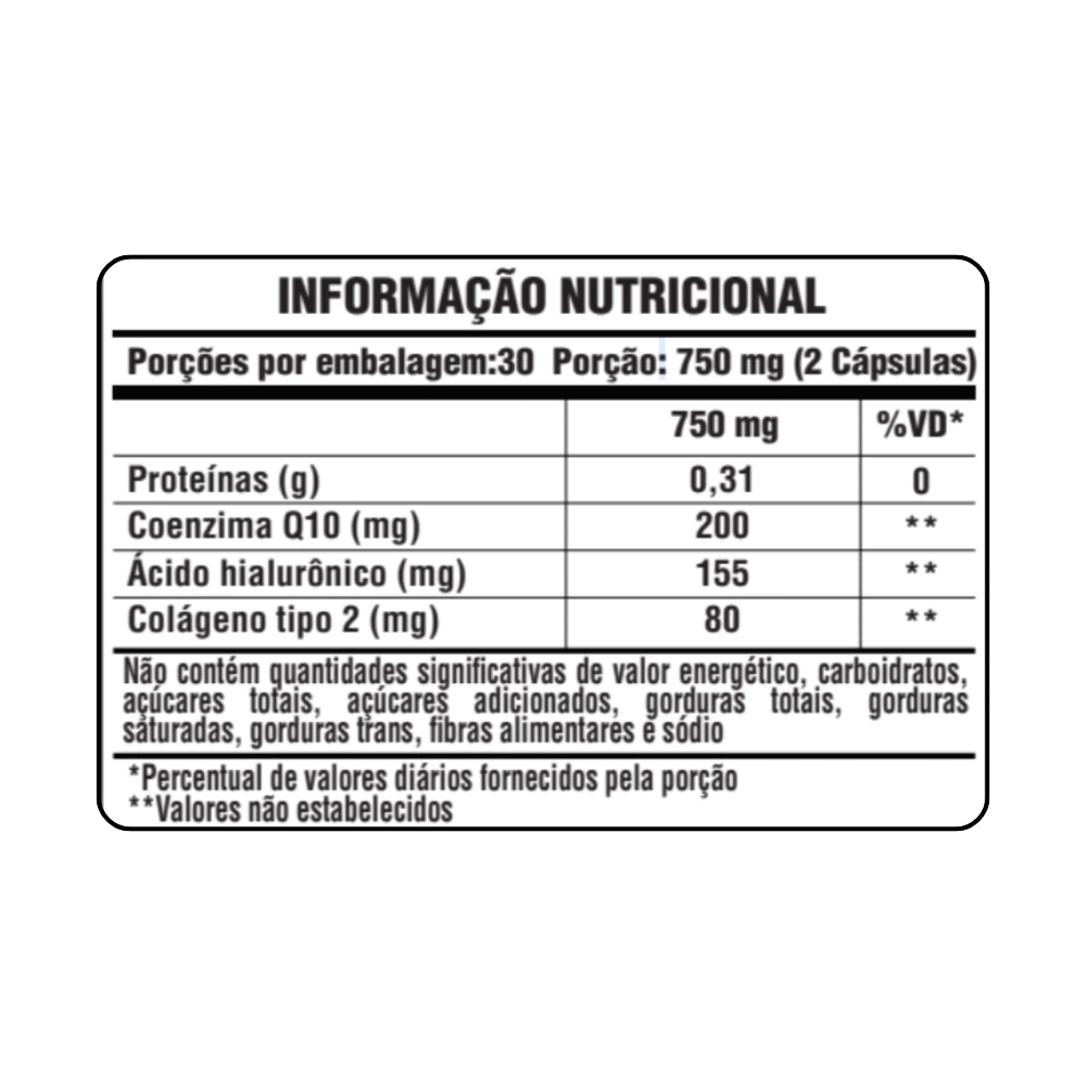 Coenzima Q10 (Ubiquinona), colagenotipo 2, ácido hialurônico (hialuronato de sódio) epeptídeos bioativas de colágeno hidrolisado.