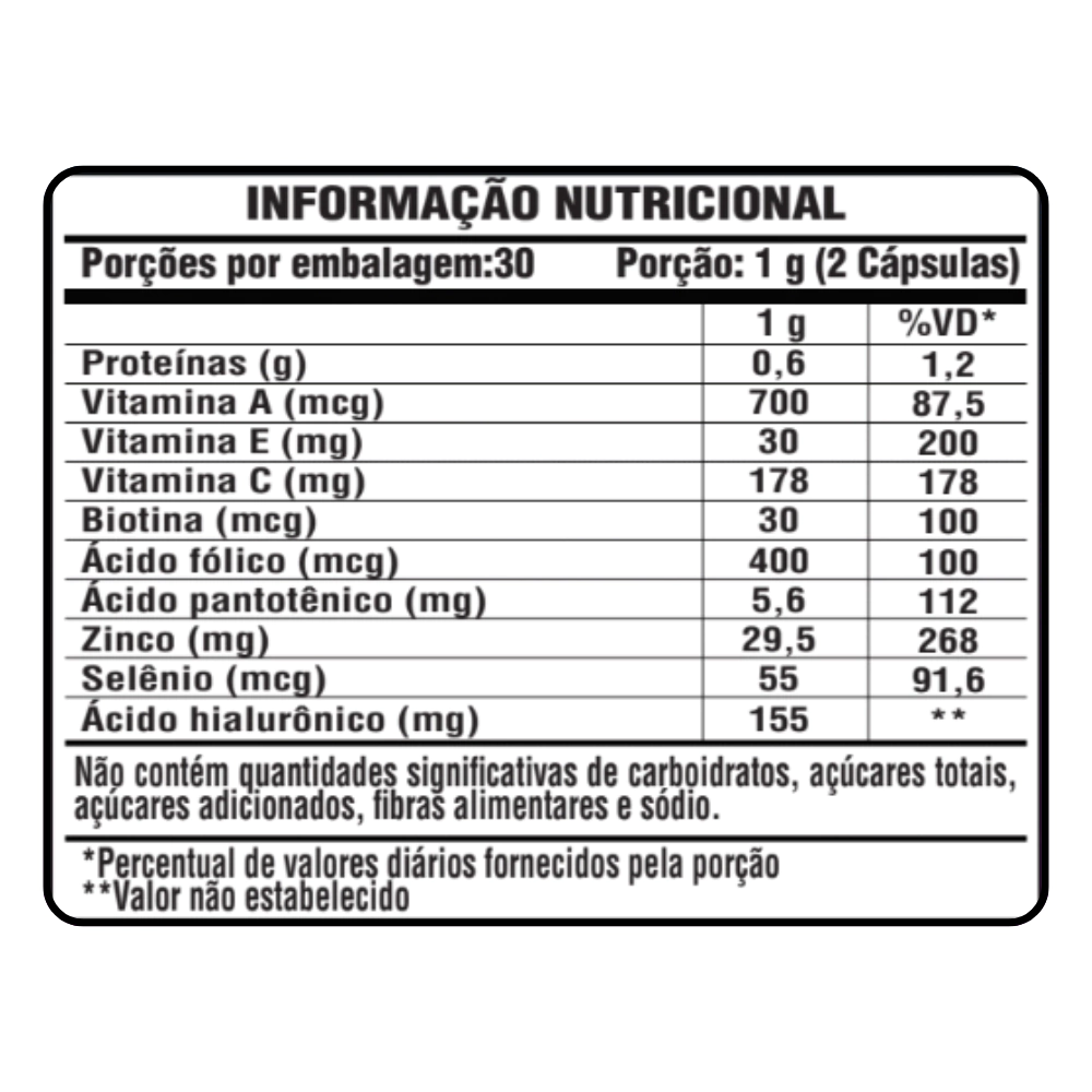 Colágeno hidrolisado, ácido ascórbico (vitamina C), hialuronato de sódio obtido pela fermentação de Streptococcus zooepidemicus, alpha-tocoferol (vitamina E), bisglicinato de zinco, DL- pantenol (ácido pantotênico), retinol (vitamina A), ácido fólico (vitamina B9), D-biotina (vitamina B7), selenato de sódio.