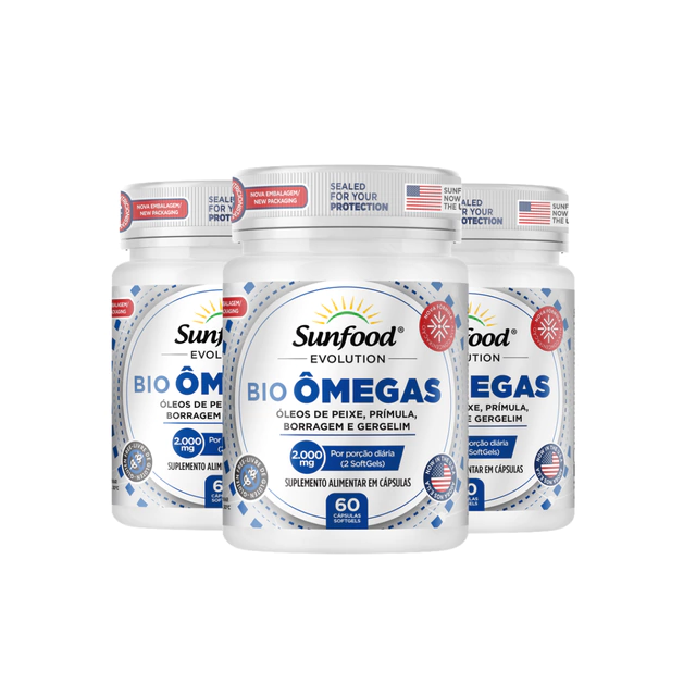 Blend completo de ácidos graxos essenciais! Combinando óleo de peixe (rico em ômega-3 EPA/DHA), óleo de linhaça (ômega-3 vegetal), óleo de borragem (rico em GLA) e óleo de gergelim (ômega-6 e ômega-9), esse suplemento auxilia na saúde cardiovascular, no equilíbrio hormonal, na resposta anti-inflamatória e na hidratação da pele.