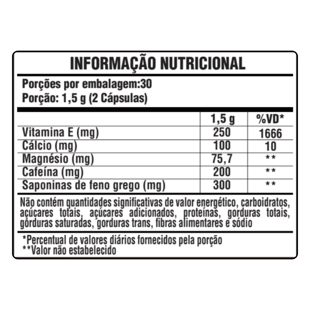 BISGLICINATO DE CÁLCIO, VITAMINA E (ALFA-TOCOFEROL), AMORA MIÚRA, FENO GREGO E CAFEÍNA.