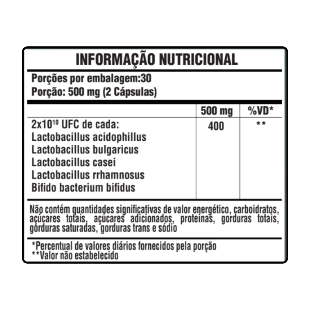 INGREDIENTES: LACTOBACILLUS ACIDOPHILUS, LACTOBACILLUS BULGARIUS, LACTOBACILUS CASEI, LACTOBACILUS RHAMNOSUS, BIFIDOBACTERIUM BIFIDUM E FRUTOOLIGOSSACARIDEOS (FOS). COMPOSIÇÃO DA CÁPSULA: GELATINA DE AMIDO DE FÉCULA DE MANDIOCA, ÁGUA E GLICERINA