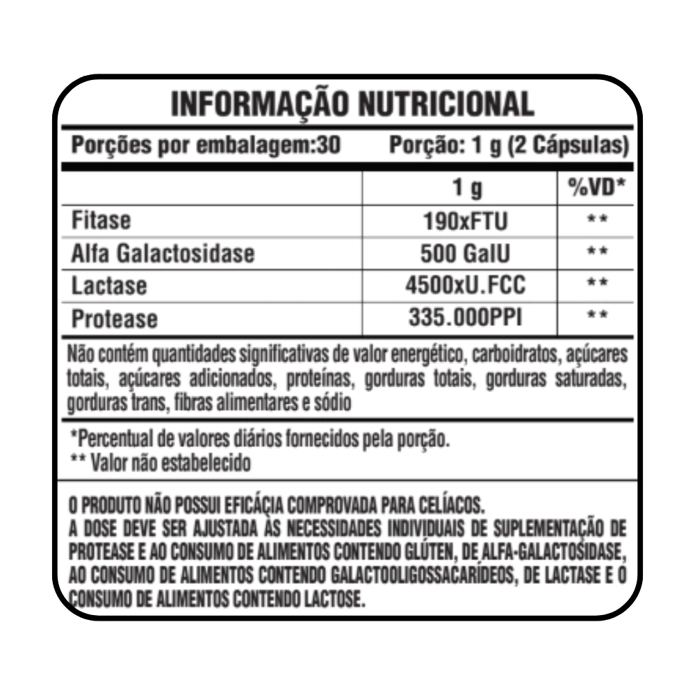 INGREDIENTES: Protease de Aspergillus niger expressa emAspergillus niger, lactase de Aspergillus oryzae, alfa-galactosidase de Aspergillus niger, fitase de Aspergillus niger.Antiumectante: dióxido de silício coloidal, estearato de magnésioe carbonato de cálcio. Composição da cápsula: gelatina e águapurificada. Agente de massa: glicerina.
