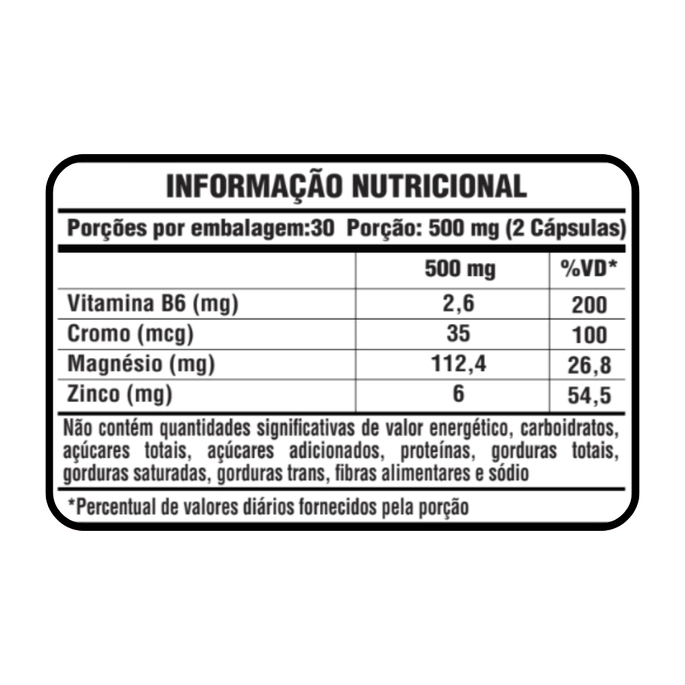 Magnésio bisglicinato, zinco bisglicinato, picolinato de cromo, cloridrato de piridoxina (vitamina B6).