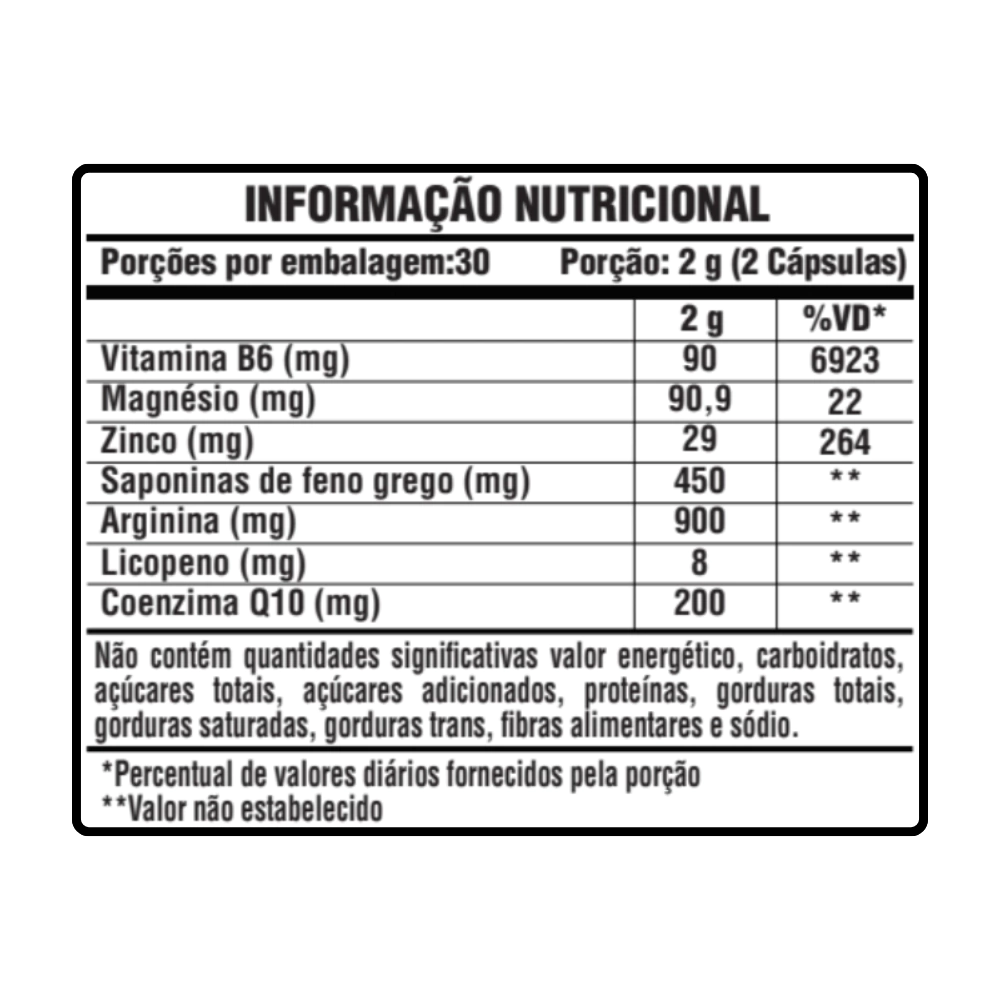 L-arginina, extrato de semente de feno grego (Trigonella foenum- graecum L.), bisglicinato de magnésio, coenzima q10, cloridrato de piridoxina, bisglicinato de zinco e licopenode tomate.