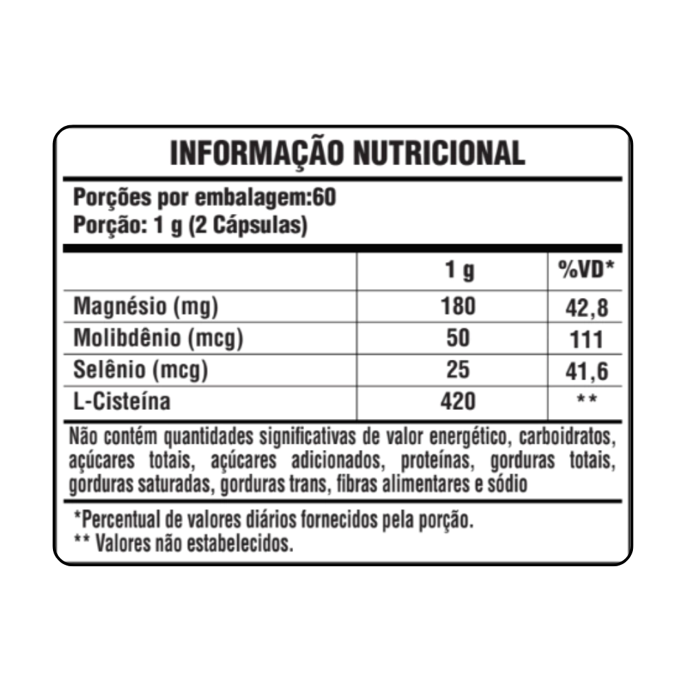 Bisglicinato de magnésio, N-Acetil L-Cisteína, selenato de sódio e molibdato de sódio.