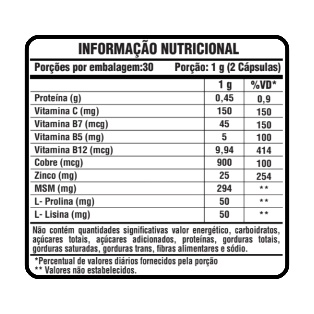 INGREDIENTES: Colágeno hidrolisado,MSM (metilsufonilmetano),ácido ascórbico (vitamina C), L-Prolina, cloridrato de L-Lisina,bisglicinato de zinco, DL-pantenol (vitamina B5), bisglicinato decobre, D-biotina (vitamina B7), cianocobalamina (vitamina B12) .Antiumectante: dióxido de silício coloidal, estearato de magnésio ecarbonato de cálcio. Composição da cápsula: gelatina eáguapurificada. Agente de massa: glicerina. Corante: dióxido de titânio